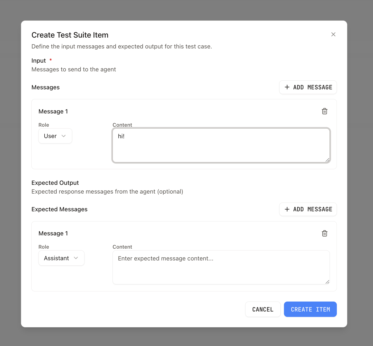 • Input — JSON object with a messages array. Each message has a role (user, assistant, or system) and content in the same shape as chat messages elsewhere in the product (for example text strings, or parts for richer content). This is what the agent sees when the item is run.